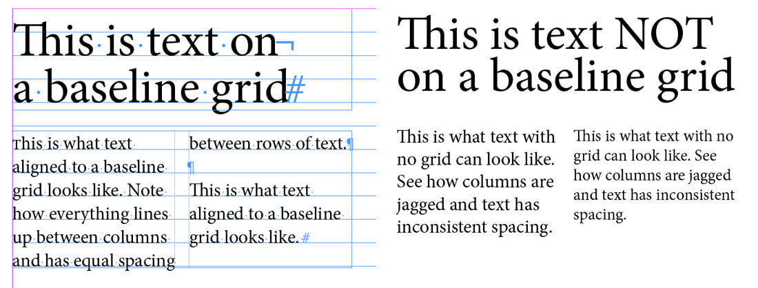 基線網(wǎng)格是指一組具有相等間隔的水平線的網(wǎng)格集——你可以把它想象成在小學時期使用的格式紙。字母的底部(基線)位于這些行上,因此文本行之間的間距相等,文本列也相互排列對齊。