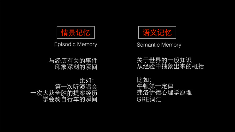加拿大心理學(xué)家圖爾文認為,長期記憶分為兩種:情景記憶和語義記憶。
