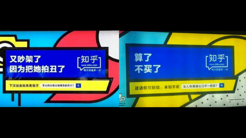 比如近期知乎在地鐵投放的一組廣告,就是采用了典型的場景化文案。"又吵架了,因為把她拍丑了",部分審美堪憂的直男朋友看到這句文案時,難免眉頭一皺心頭一緊,回想起一些不堪的往事;"算了,不買了",則會讓所有口是心非的girl們會心一笑。文案的背后擁有活生生的場景支撐,更易引發(fā)共鳴,而當(dāng)用戶下一次經(jīng)歷相似的場景時,也更容易記起。