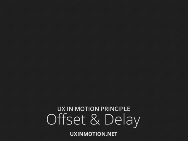 利用偏移和延遲來錯(cuò)開元素的運(yùn)動(dòng)時(shí)間,表明元素之間的層級(jí)與關(guān)系。設(shè)計(jì)師利用錯(cuò)開運(yùn)動(dòng)時(shí)間的方法,讓信息或界面元素按照有所區(qū)別的秩序進(jìn)退場(chǎng),利用明顯的錯(cuò)序運(yùn)動(dòng)暗示用戶信息與界面元素之間或許存在某些區(qū)別,或利用錯(cuò)序的方法吸引用戶的注意。但一般情況設(shè)計(jì)師不應(yīng)該使用太多的延時(shí)效果,因?yàn)槠┤缯f網(wǎng)絡(luò)的加載本身就已經(jīng)需要時(shí)間,所以延遲效果的使用最好只用于技術(shù)。