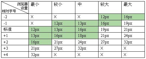 從表中可以看到,沒(méi)有一個(gè)相對(duì)字體大小可以落在12 px - 16 px區(qū)間,也就是說(shuō),如果IE“文字大小”選項(xiàng)的“最小”逐漸改為“大”,因此,不管什么相對(duì)設(shè)置字體大小,總能保持理想的顯示效果。從表中可以看出,設(shè)置為““-2、-1、標(biāo)準(zhǔn)大小、+1、+2”的文字,在調(diào)整的過(guò)程中瀏覽器的“大小”,有時(shí)候顯示的字體大小12 px - 16 px范圍內(nèi)。往往需要各種不同的頁(yè)面大小字號(hào)來(lái)區(qū)分不同的內(nèi)容,應(yīng)該選擇什么樣的相對(duì)字體大小?中國(guó)設(shè)計(jì)師的選擇并不多。
