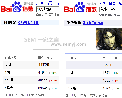 以下是用百度指數(shù)搜索“免費(fèi)郵箱”和“163郵箱”得到的數(shù)據(jù):