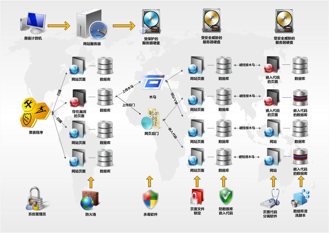 頁面代碼分離軟件批量清除網(wǎng)站頁面中的惡意代碼;數(shù)據(jù)庫清洗腳本清理數(shù)據(jù)庫中的惡意代碼。