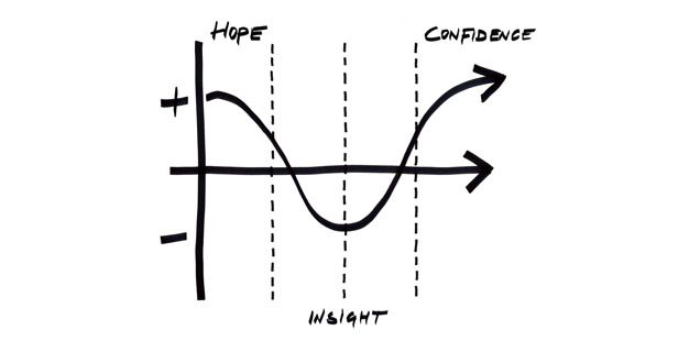 第三個標簽在v形圖中寫著“洞察力。”這是點之間的“A”、“B”和所有的失敗和沮喪,深夜飲酒狂歡的謊言。每個人都有過這個山谷和獲得他們所需要的洞察力成功做好工作的信心。