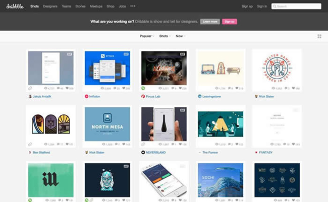 Dribbble的卡片很容易分辨、排列、和點擊,讓人了解某個項目的詳細信息。它的設(shè)計在淺色背景上使用了白色的卡片,每張圖片下方有個內(nèi)容區(qū)域顯示作品。淺色在桌面端表現(xiàn)尤其優(yōu)秀,對于眼睛很友好。