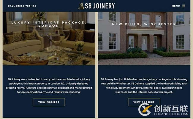 SB Joinery則選用了深色的配色——在深色背景上使用反白文字——并在圖片上疊加了顏色,讓視覺重心停留在文字和幽靈按鈕上。彈出菜單同樣使用了深色主題。得益于粗字體和高對比度的色彩,深色風格的卡片易讀性強,極其實用。