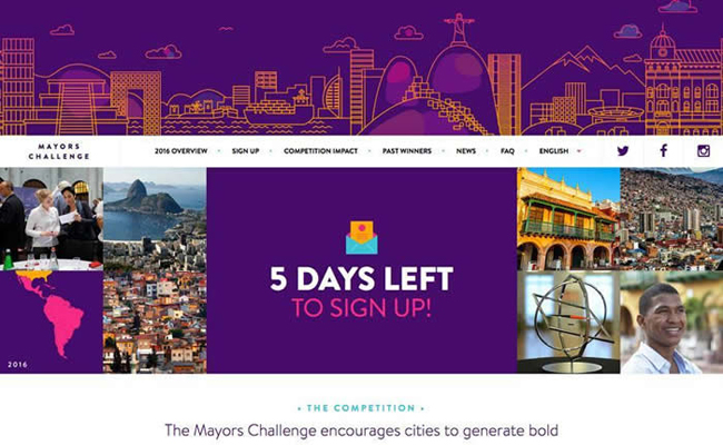 The Mayors Challenge的設(shè)計充分運用了material design的概念,卻沒有做出Google產(chǎn)品的感覺。顏色鮮艷而明亮,同時卡片在某種程度上卻非常簡單和“不明確”。圖標、文字和鏈接中都有鮮艷色彩,所有這些暗示,都在引導用戶在網(wǎng)站上進行操作。