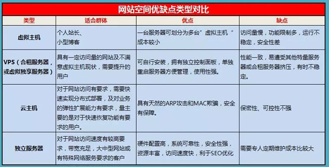 空間主要分為虛擬主機(jī)、VPS、云主機(jī)、獨(dú)立服務(wù)器四大類型,各有其優(yōu)缺點(diǎn),如下圖所示: