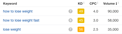 我們來看下面這組數(shù)據(jù),減肥;比如何更快的減肥;搜索量大,數(shù)據(jù)對比非常明顯: