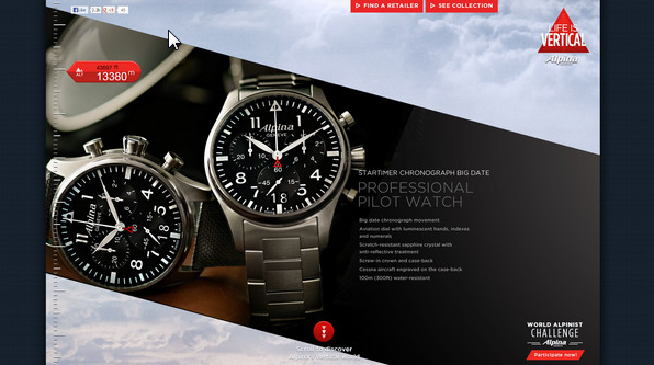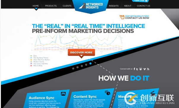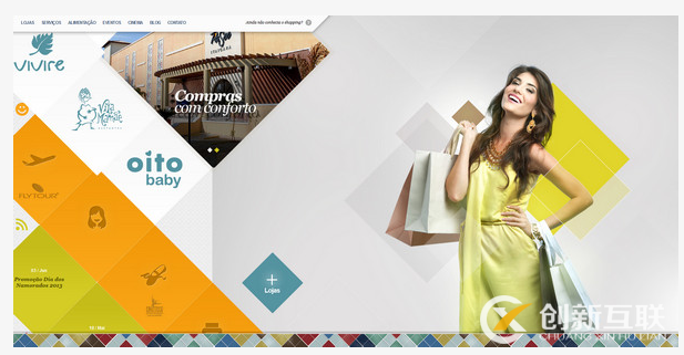 我們可以看到該網(wǎng)站使用各種斜線拼接而成大小不同的方形,整體形狀感、時(shí)尚感非常強(qiáng),頁(yè)面總體呈多塊狀分布,但多而不亂非常具有設(shè)計(jì)的美感。網(wǎng)站里的斜方形無(wú)處不在,拼嵌式的菱形,裝飾性的菱形,按鈕的菱形,很好的主題一致性。