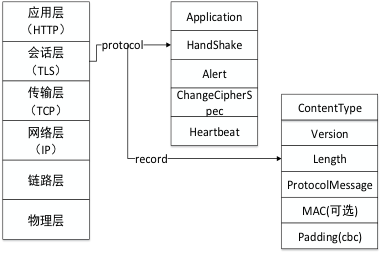 TLS 協(xié)議本身又是由 record 協(xié)議傳輸?shù)模瑀ecord 協(xié)議的格式如上圖最右所示。