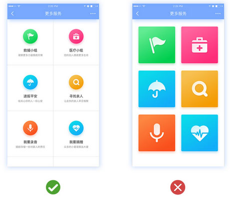 我們在進(jìn)行網(wǎng)站制作時,如果在決定使用某一風(fēng)格的圖標(biāo)設(shè)計之后,在相同木塊下,請盡量使用同一的風(fēng)格的圖標(biāo),如填充圖標(biāo)的色彩飽和度;線性圖標(biāo)的線條粗細(xì);擬物風(fēng)格的光線陰影等。成都網(wǎng)站制作 還發(fā)現(xiàn)很多人都喜歡純圖標(biāo)式的設(shè)計,去掉文案試圖讓圖標(biāo)看起來更高大上,但是往往忽略了圖標(biāo)最重要的作用是提示用戶該按鈕的功能。舉個例子,如下圖所展示圖標(biāo),去掉文案之后很多圖標(biāo)根本無法準(zhǔn)確表達(dá)出確切的含義,這也是圖形的缺陷。我們在使用圖標(biāo)時要盡量避免出現(xiàn)這種情況。
