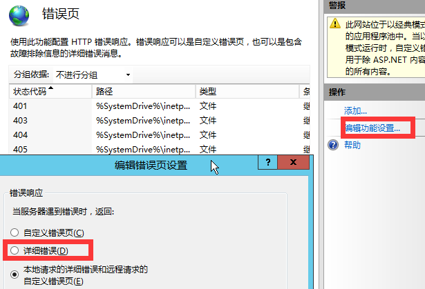 方法:還在中IIS管理器 > 錯(cuò)誤頁 設(shè)置配置出錯(cuò)返回的頁 雙擊進(jìn)入 > 點(diǎn)右側(cè)的 編輯功能設(shè)置 > 選中詳情錯(cuò)誤