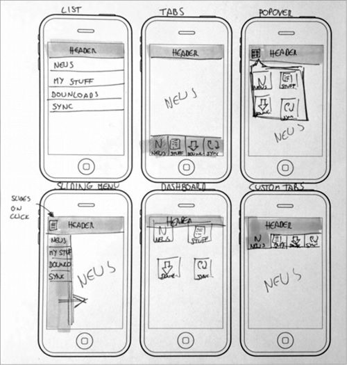 上面的截圖顯示了6個(gè)不同的想法為一個(gè)應(yīng)用程序的主菜單(,加上生動(dòng)地證明了我的草圖不漂亮)。我不經(jīng)常拿出六個(gè)版本(我想告訴自己,我是一個(gè)結(jié)構(gòu)的第一人),但我會(huì)盡量去創(chuàng)造一個(gè)鍵屏幕至少有三個(gè)變種。因?yàn)檫@是頭腦風(fēng)暴,你會(huì)想了很多的選擇在后面討論,數(shù)量是你的朋友在這里。