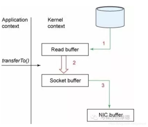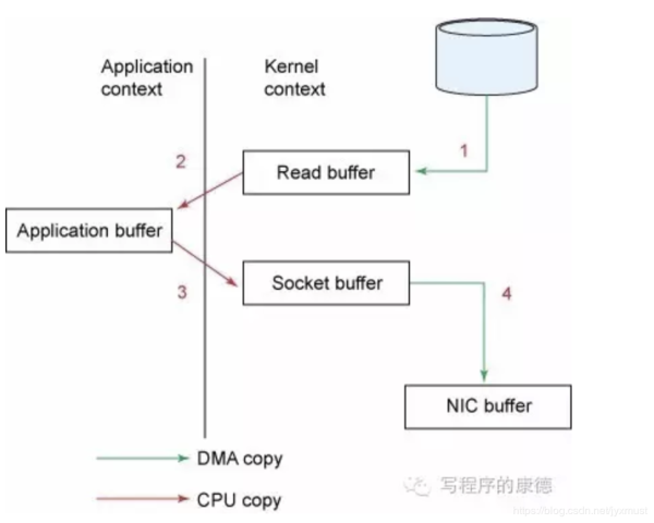 Zero Copy中直接從內核空間(DMA的)到內核空間(Socket的),然后發(fā)送網卡。