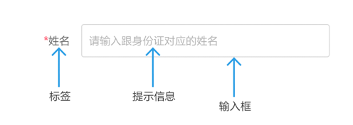 一個輸入框,通常有標(biāo)簽名稱label、提示信息placeholder(輸入信息后提示文字消失)、初始值value(需手動刪除)。如果是必填表單,在適當(dāng)位置(標(biāo)簽的前后,輸入框后)加上紅色*號(或其他符號)。