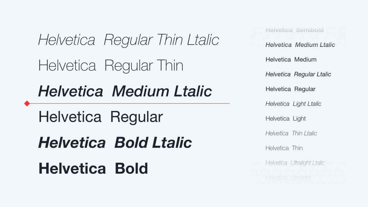 一個族類包含不同的字體,然而一個字體又可能有好幾種字族。如果電腦安裝了Helvetica,在Sketch字體選擇器中會發(fā)現(xiàn)超過40多個前綴是Helvetica的字族。這是為了協(xié)助人們在不同的使用場景下表達(dá)合適的意思。