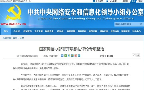 網(wǎng)信辦部署開展跟帖評(píng)論專項(xiàng)整治,并于21日召開全國(guó)跟帖評(píng)論專項(xiàng)整治視頻會(huì)議,部署集中治理跟帖評(píng)論存在的突出問題,各省(區(qū)、市)網(wǎng)信辦以及部分中央新聞網(wǎng)站、商業(yè)網(wǎng)站負(fù)責(zé)人參加。