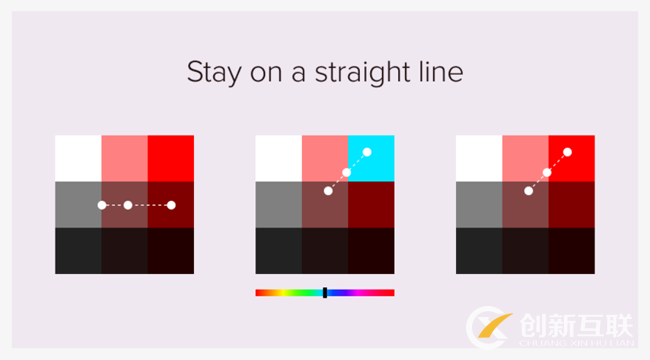 當(dāng)我在調(diào)色板上選擇色彩的時(shí)候,我會(huì)傾向于沿著直線路徑來(lái)挑選色彩,從左到右,從上到下,或者沿著對(duì)角線來(lái)選取色彩。這樣所獲得的一套配色可以兼顧到不同的按鈕狀態(tài)(可用/不可用,活動(dòng)/非活動(dòng)),兼顧到視覺(jué)主體和邊框,背景等。我們也可以在取色器的同一個(gè)位置取色,調(diào)整色調(diào),獲得的一組色度接近色調(diào)不同但是高度協(xié)調(diào)的色彩組合。上圖中,中間那個(gè)就是。