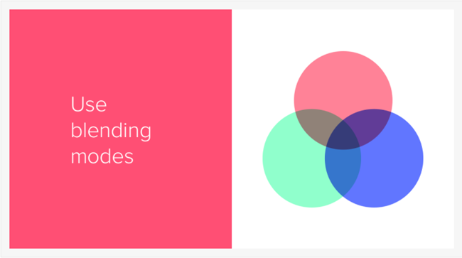 如果你能善用混合模式,就能創(chuàng)造出令人著迷的配色方案。通過(guò)簡(jiǎn)單的疊加兩個(gè)色塊,選擇“Multiply”(乘法)混合模式,就能得到匹配的第三種色彩。在白色背景上,我們還能通過(guò)調(diào)整透明度來(lái)快速調(diào)整色彩的明暗。不過(guò)我始終覺(jué)得在黑色背景上來(lái)調(diào)整色彩更有意思,搭配混合模式來(lái)探索色彩的可能性,總能創(chuàng)造新的搭配。這種同色彩的交互方式,為許多經(jīng)驗(yàn)豐富的設(shè)計(jì)師所使用。