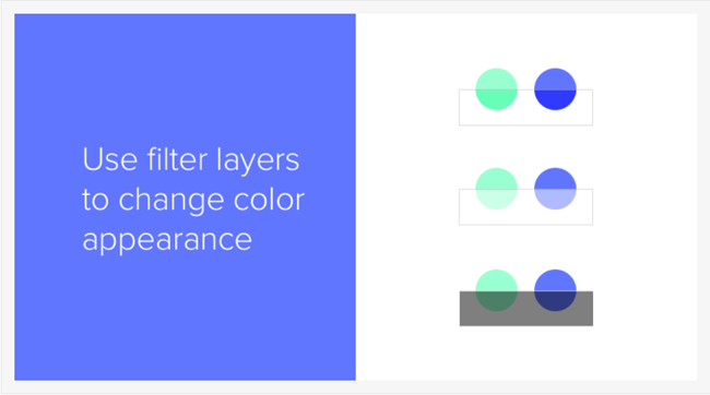 想象有一張半透明的紙,當(dāng)我們將它置于色彩上方的時(shí)候,它能夠從視覺(jué)上“消減”色度。我們可以在PS和Sketch中來(lái)模擬這樣的“紙”,新建形狀,通過(guò)調(diào)整透明度和混合模式,或者搭配使用來(lái)實(shí)現(xiàn)不同的效果,我們還可以調(diào)整紙張本身為白色或者黑色,在疊加混合模式下,能對(duì)色彩的飽和度產(chǎn)生不同的影響。在有的UI設(shè)計(jì)項(xiàng)目當(dāng)中,會(huì)借助這樣的技術(shù)來(lái)暫時(shí)調(diào)整整個(gè)區(qū)域的敏感色度,這比改色更加輕松,還保持了色彩之間的協(xié)調(diào)度。