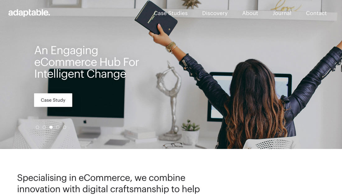 Adaptable 的網(wǎng)站在這個(gè)事情上就做的很好。盡管輪播圖中的圖片和文本的內(nèi)容各不相同,但是幾乎都采用了統(tǒng)一的左對(duì)齊,文本和行為召喚按鈕也是做對(duì)齊,元素與元素之間的間距也很統(tǒng)一,這種一致的美感讓人非常舒適。