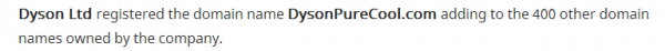 戴森公司近日注冊了一枚新域名DysonPureCool.com。在2015年3月,戴森在北京舉行發(fā)布會上推出旗下首款空氣凈化器產(chǎn)品Dyson Pure Cool,此次注冊域名應(yīng)該是為了進(jìn)行品牌保護(hù)。