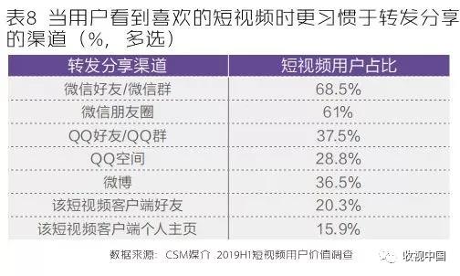 除創(chuàng)作外,社交也是短視頻平臺促活的重要方式。2019年1月,多閃、馬桶MT、聊天寶三款短視頻社交軟件同時上線。2019年5月,微視上線可直接同步30秒視頻至朋友圈功能,短視頻社交領(lǐng)域競爭激烈。然而,在短視頻客戶端,當(dāng)用戶看到喜歡的內(nèi)容,接近90%的用戶將短視頻分享至微信,50%的用戶分享至QQ群,超過三分之一的用戶分享至微博。短視頻客戶端尚未形成用戶間成熟的社交互動閉環(huán),平臺社交價值未充分釋放。