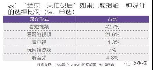 短視頻以短小便捷的傳播形態(tài)、較強(qiáng)的視覺感染力,快速聚合流量,搶占用戶時間,在視頻行業(yè)優(yōu)勢地位得到進(jìn)一步強(qiáng)化。在假設(shè)情境中,“結(jié)束一天忙碌的工作和學(xué)習(xí)之后,如果只能接觸一種媒介”,42.7%的網(wǎng)民選擇短視頻。該比例在所有視頻形式中居首。