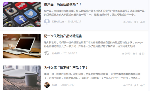 這個(gè)其實(shí)跟我們前面說(shuō)的圖服務(wù)與選題類似,下面是人人都是產(chǎn)品經(jīng)理的截圖,風(fēng)格貼近原本自己所做的產(chǎn)品的定位:互聯(lián)網(wǎng)相關(guān),并且圍繞著這個(gè)定位去做配圖