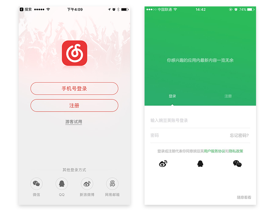 郵箱、手機號、用戶名,都屬于自建賬號體系的方式,除此之外還有一種方式:第三方賬號登錄。用戶不需要輸入注冊登錄信息,直接選擇第三方賬號就能完成登錄。國內(nèi)常見的第三方賬號有微博、微信、QQ、豆瓣、人人等,國外常見的第三方賬號有Facebook,Twitter,Google等。