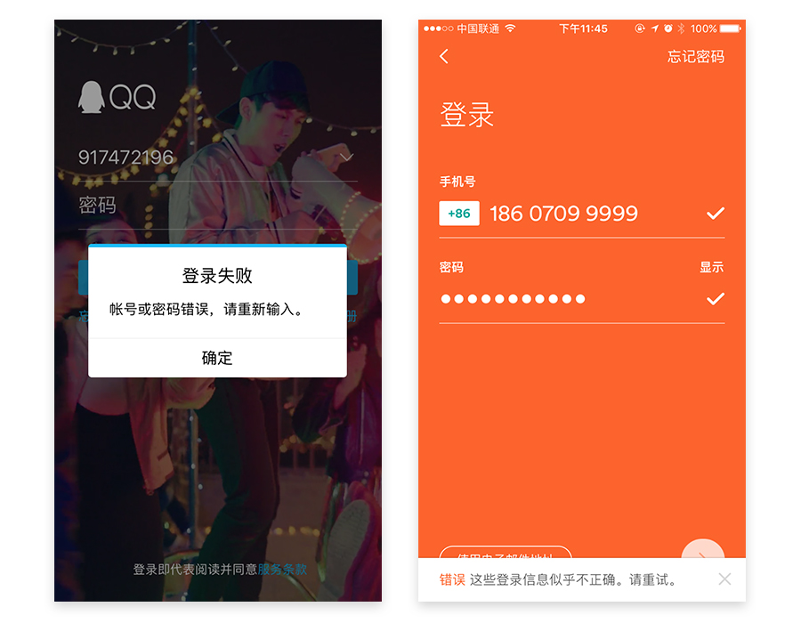 臨時框也有兩種形式,一種是下圖左側(cè)的對話框形式,這需要用戶點擊確認(rèn)才能進(jìn)行下一步操作。一種是toast的形式,彈出一兩秒后自動消失。個人更傾向于第二種形式,因為第一種形式相當(dāng)于強制中斷了用戶的操作,用戶需要點擊確認(rèn)才能回到原來的操作流程。而toast則起到了提示的效果,并且沒有打擾到用戶。下圖右側(cè)的airbnb,在用戶輸錯密碼時,不光有底部的臨時框提示,還將整個登錄頁面的背景色油綠色變?yōu)樾涯康某壬@種設(shè)計在提示用戶的前提下,還做到了賞心悅目,是個不錯的設(shè)計思路。