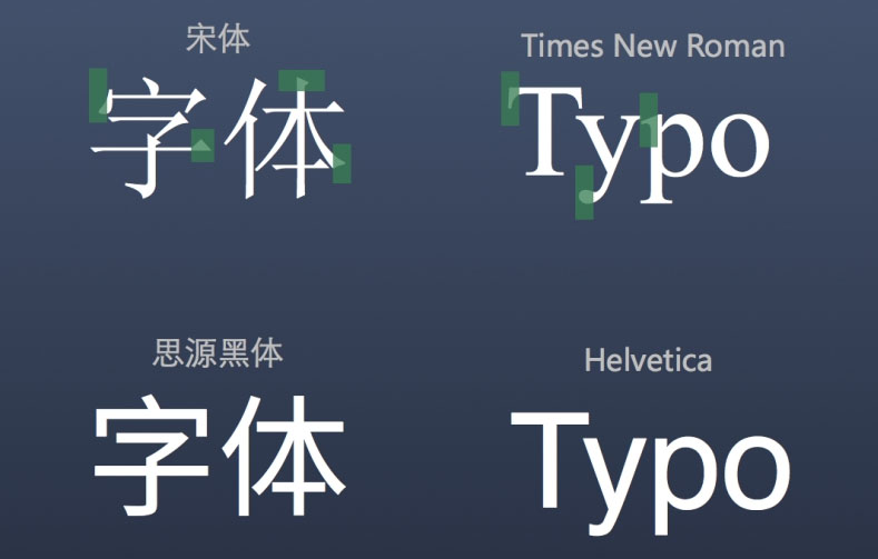 在西方國(guó)家的字母體系,分成兩大字族:serif(襯線字體)及sans serif(無(wú)襯線字體)。襯線字(下圖中的宋體、Times New Roman)是指在字的筆畫開始及結(jié)束的地方有額外的裝飾,而且筆畫的粗細(xì)會(huì)因直橫的不同而有所不同。 相反的,無(wú)襯線字(下圖中的思源黑體、Helvetica)就沒有這些額外裝飾,而且筆畫粗細(xì)大致上是差不多。