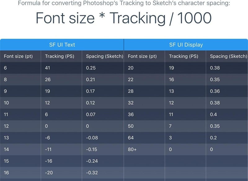 注:如果你使用諸如Sketch或Photoshop的工具來(lái)進(jìn)行設(shè)計(jì),那么當(dāng)你設(shè)置的字體大于等于20 points的時(shí)候,你需要切換到展示模式。iOS會(huì)根據(jù)字體大小為San Francisco自動(dòng)調(diào)整字間距。