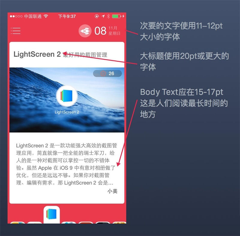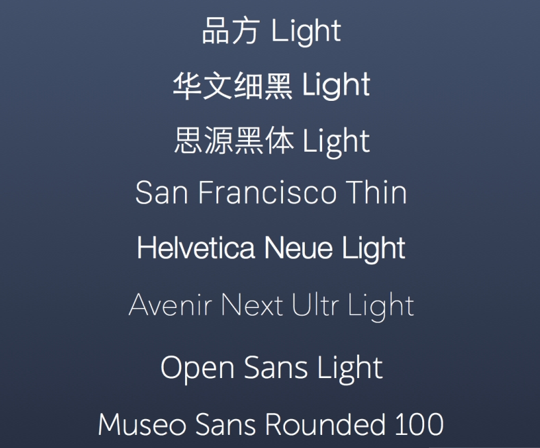 當(dāng)我們?cè)O(shè)置更大的字體來(lái)獲得更好的易讀性的同時(shí),我們也應(yīng)相應(yīng)地減小字體的字重(粗細(xì)),考慮Light,Thin或者Ultra Thin。過重的字體會(huì)太過醒目,從而影響其他內(nèi)容的顯示效果。