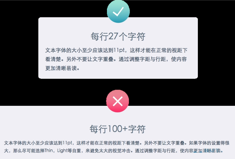 行長(zhǎng)指單行文字的長(zhǎng)度,如果一行中包含的字?jǐn)?shù)太多,文本內(nèi)容將會(huì)很難閱讀。英文字符一般在45-90字比較適宜,而中文35-60字為宜。合理的行長(zhǎng)使用戶在行間跳轉(zhuǎn)時(shí)非常感到輕快和愉悅,反之則會(huì)使閱讀成為一種負(fù)擔(dān)。