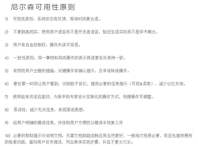 當(dāng)設(shè)計(jì)完成后最好對(duì)自己的方案進(jìn)行排查,很多時(shí)候容易當(dāng)局者迷“忽視”了很多問(wèn)題。這里可以積極請(qǐng)教同事尋找問(wèn)題,或者使用尼爾森的可用性原則進(jìn)行排查。