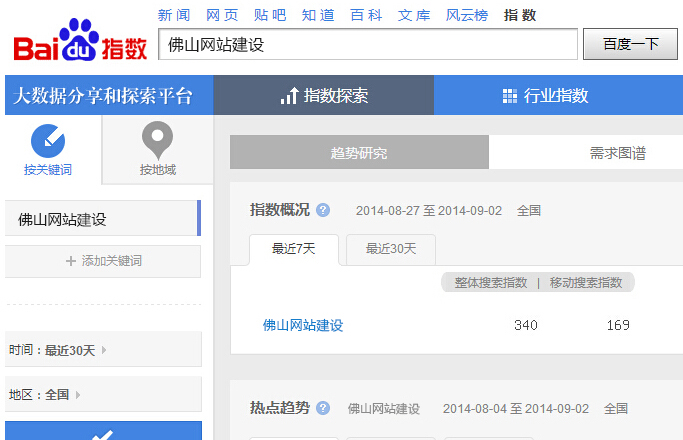三、通過百度指數(shù)來了解相關關鍵詞的搜索量,通過這個可以很直接的知道您所需要確定的關鍵詞是否熱門,是否有一定的搜索量,咱們還是以“手機網(wǎng)站建設,佛山