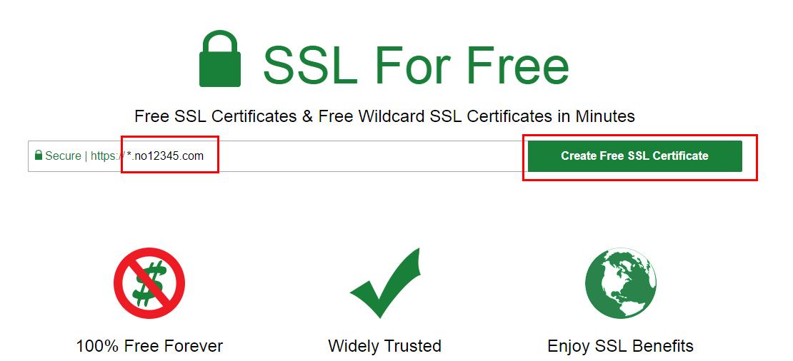 2、如果*. 域名,例如給我們*2345.com 這個域名申請泛域名證書,直接輸入*.*2345.com,點擊 Create Free SSL Certificate 按鈕。如圖: