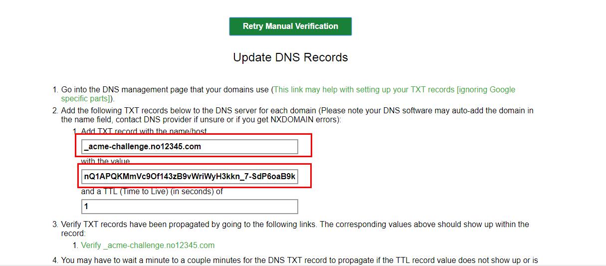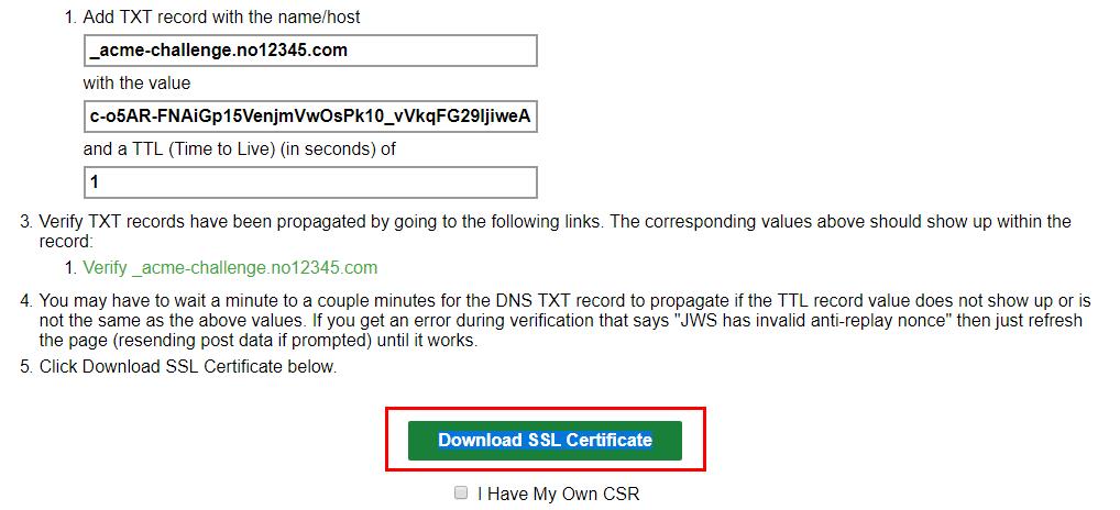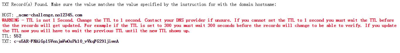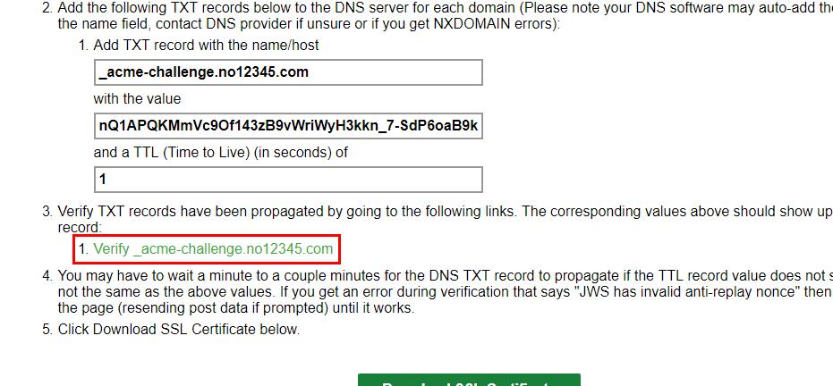 需要注意的是由于域名原因ttl限制無法寫1,導(dǎo)致更新時間慢了很多,所以驗證通過比較慢,需要大家等驗證生效了,才可以下載ssl證書,否則下載不了。