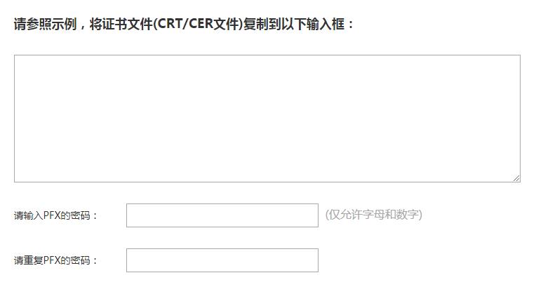 將certificate.crt和private.key用記事本打開,將內(nèi)容復(fù)制到CRT/CER文件框和KEY文件框內(nèi)容,輸入PFX的密碼,點擊合成pfx文件按鈕,下載pfx證書就可以了。如圖: