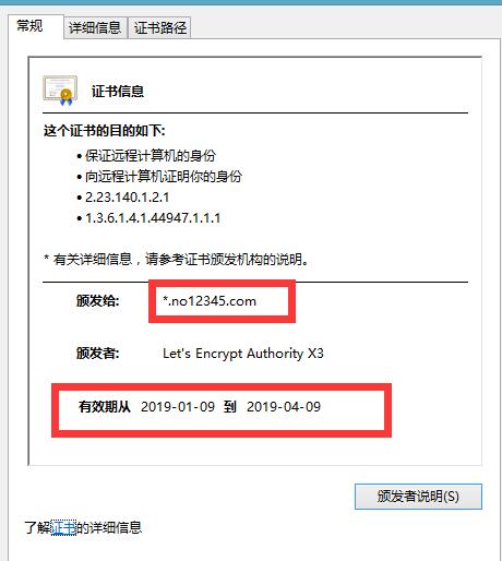 用以上方法申請的泛域名證書有效期是3個月,用的還不錯,畢竟是免費申請的,域名證書過期后只能重新申請!