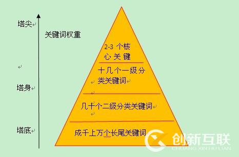 次一級(jí)關(guān)鍵詞相當(dāng)于塔身部分,可能有十幾個(gè),放在一級(jí)分類首頁(yè)。意義最相關(guān)的兩三個(gè)關(guān)鍵詞放在一起,成為一個(gè)一級(jí)分類的目標(biāo)關(guān)鍵詞。