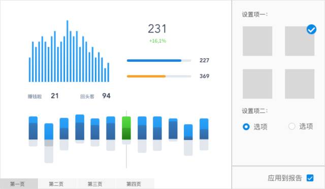 報告設置針對的是全局的內(nèi)容,頁面設置針對的是當前頁的內(nèi)容,由于技術是按照兩個入口實現(xiàn)該功能的,邏輯上也清晰,所以設計時兩個入口都暴露給了用戶,但經(jīng)過可用性測試,這兩者的概念區(qū)別對用戶來說都需要一定的理解時間,首次選擇時也容易疑惑。其實這些定義產(chǎn)品內(nèi)部分清就足夠了,不需要額外暴露給用戶。