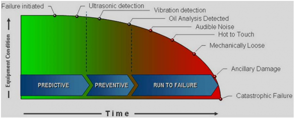 下圖顯示了采用預防性和預測性維護策略的故障概率曲線(P-F曲線)。