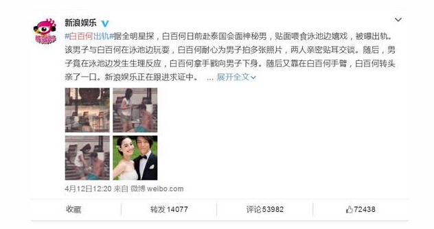 4月12日,白百何出軌事件被卓偉團(tuán)隊(duì)爆料,白百何日前赴泰國會(huì)面神秘男(疑似張愛朋),貼面喂食泳池邊嬉戲。該小鮮肉與白百何在泳池邊玩耍,白百何耐心為男子拍多張照片,兩人親密貼耳交談。隨后,男子竟在泳池邊發(fā)生生理反應(yīng),白百何拿手戳向男子下身。隨后又靠在白百何手臂,白百何轉(zhuǎn)頭親了一口……看到此情此景,我們不禁要問:事件內(nèi)幕究竟為何?白百何老公陳羽凡會(huì)作何感想?