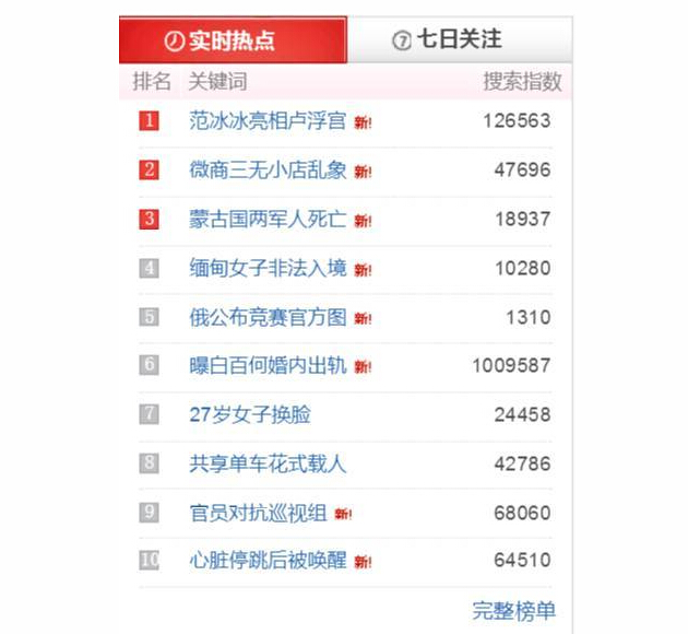 第一步,先看微博,目的是拿到最新的關(guān)鍵詞(因?yàn)榘俣鹊慕Y(jié)果要比微博滯后)。我們可以通過微博話題榜、搜索結(jié)果等等,拿到白百何出軌、視頻、出軌對(duì)象、張愛朋、小鮮肉等等這些關(guān)鍵詞,第二天肯定會(huì)繼續(xù)更新,所以要每天看。
