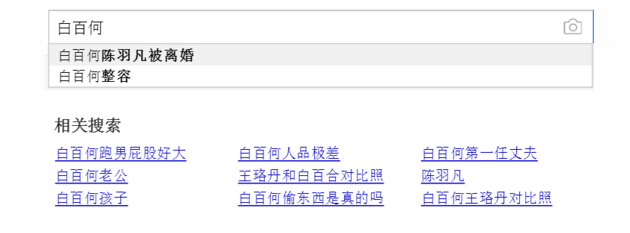 第二步,再看百度(因?yàn)榘俣鹊牧看?。首先要看的是百度風(fēng)云榜,我們拿到了“曝白百何婚內(nèi)出軌”這個(gè)關(guān)鍵詞。再搜索白百何,我們拿到了陳羽凡、王珞丹、整容、老公、離婚等這些關(guān)鍵詞,很多其實(shí)都是之前的搜索熱詞。