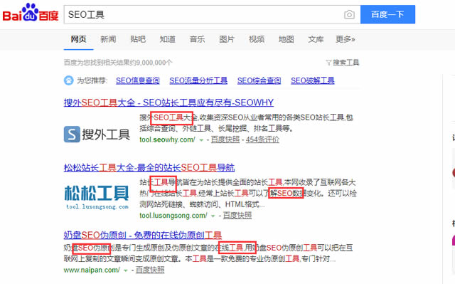 另外從圖上我們也可以看到分詞組合后得到三個價值詞SEO、SEO工具、工具,這些詞都是會被百度建立索引參與排名的重要因素,下圖是我從百度搜索結(jié)果截圖的。
