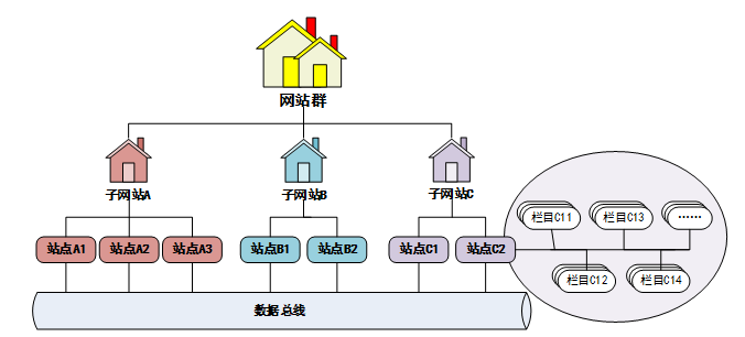 在尚品網(wǎng)站群管理平臺(tái)建立的站群系統(tǒng)中,各個(gè)網(wǎng)站統(tǒng)一由站群系統(tǒng)管理員進(jìn)行管理,各部門的網(wǎng)站管理員可在平臺(tái)上對(duì)本部門的網(wǎng)站進(jìn)行管理與維護(hù),內(nèi)容管理員通過(guò)內(nèi)容管理系統(tǒng)進(jìn)行內(nèi)容維護(hù),瀏覽者通過(guò)門戶網(wǎng)站對(duì)各個(gè)子站進(jìn)行訪問,而站群中各個(gè)子站都通過(guò)數(shù)據(jù)總線進(jìn)行數(shù)據(jù)互通,數(shù)據(jù)總線同時(shí)提供各子站、BBS論壇等應(yīng)用系統(tǒng)整合集成,同時(shí)站群中各個(gè)子站的用戶由統(tǒng)一的用戶管理系統(tǒng)提供支持。站群系統(tǒng)具有以下特性: